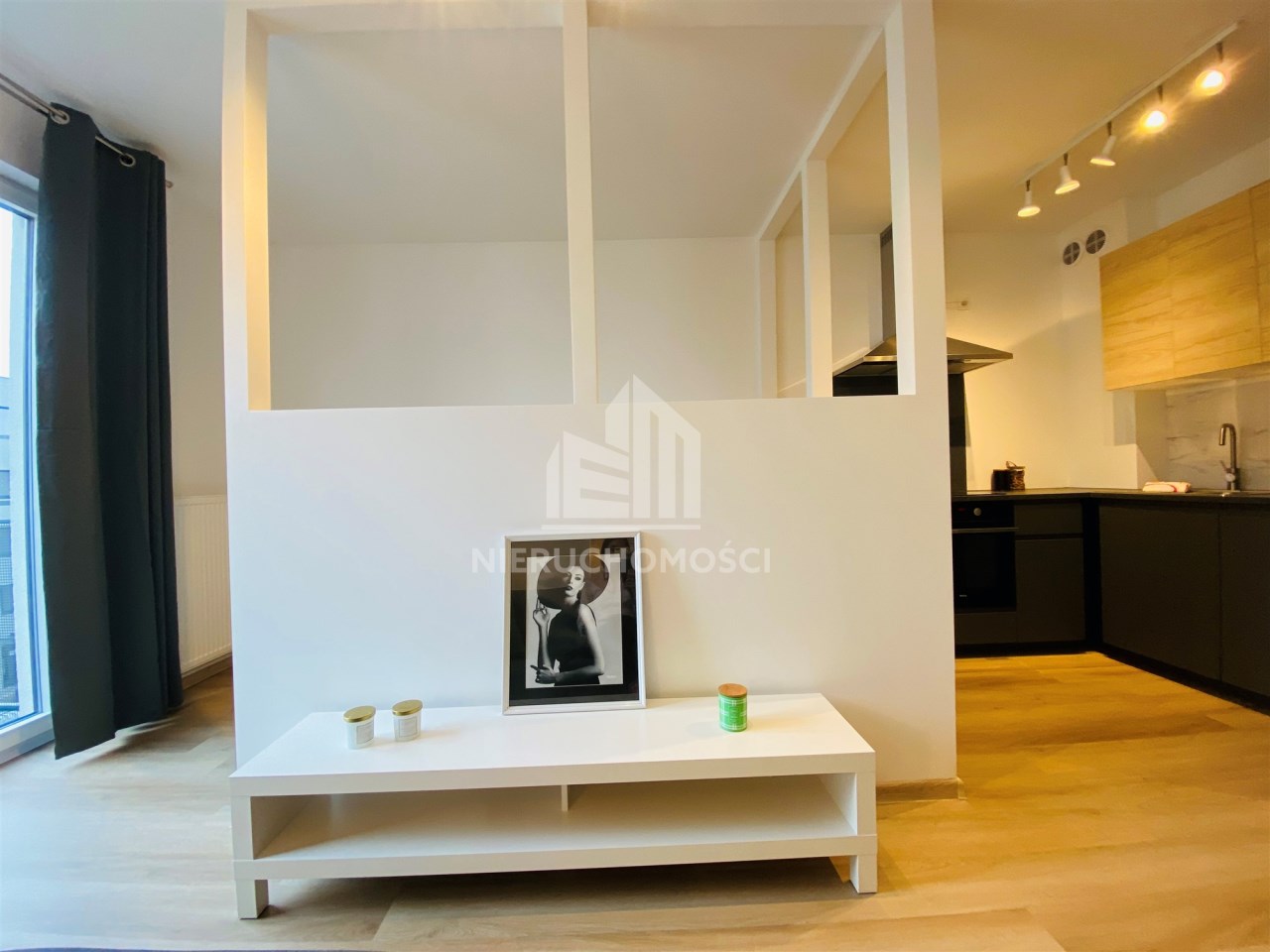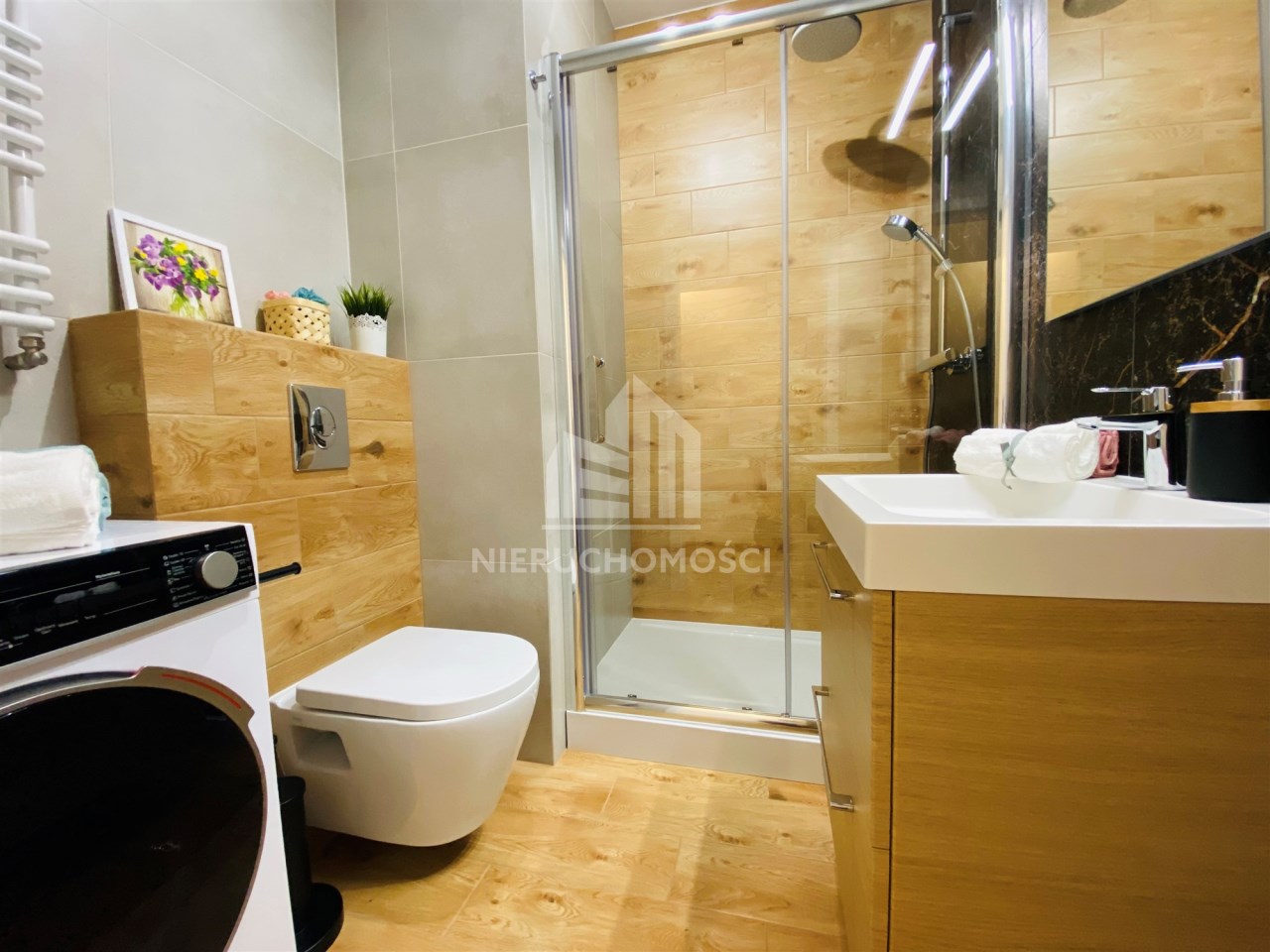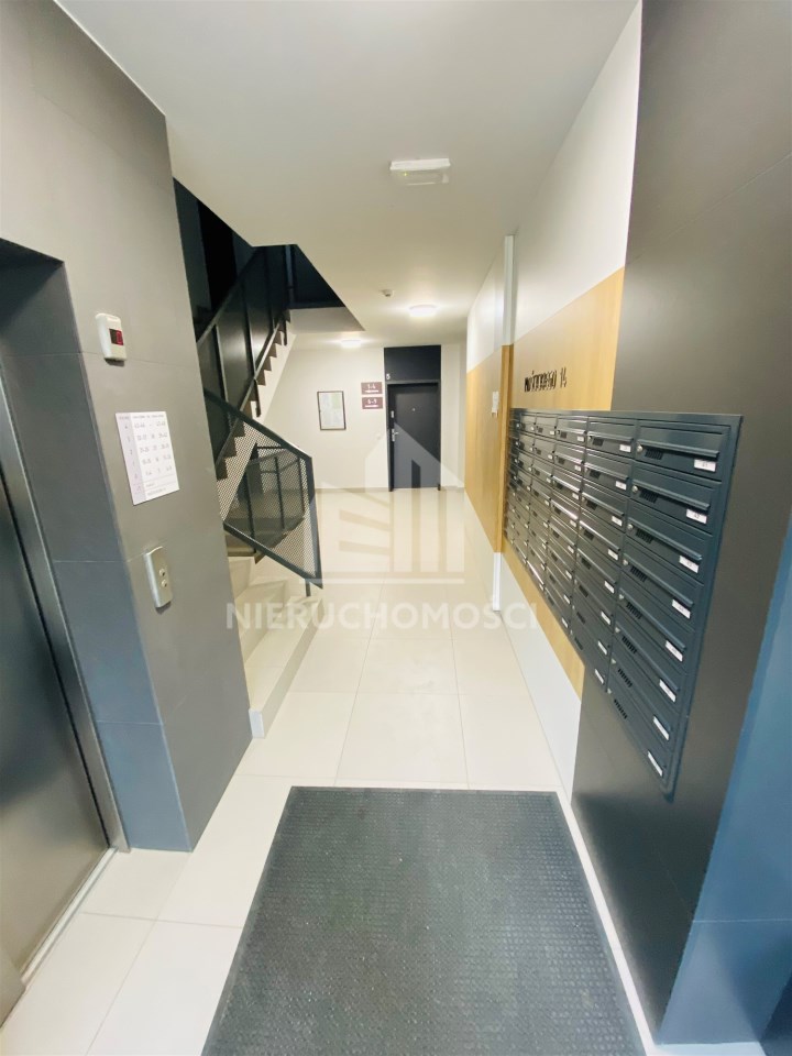 Mieszkanie jest bardzo funkcjonalne. Składa się z salonu z wyjściem na słoneczny balkon, oddzielnej, otwartej kuchni, wydzielonej sypialni, łazienki z WC, kabiną prysznicową, umywalką i pralką oraz przedpokoju z dużą szafą. Kuchnię wyposażono w nowe meble i sprzęty w zabudowie stałej. Mieszkanie jest w pełni wyposażone - wszystkie meble i sprzęty widoczne na zdjęciach pozostają do dyspozycji najemcy. Niewątpliwym atutem jest usytuowanie względem stron świata - okno wychodzące na zachód sprawia, że mieszkanie jest bardzo jasne i ciepłe.